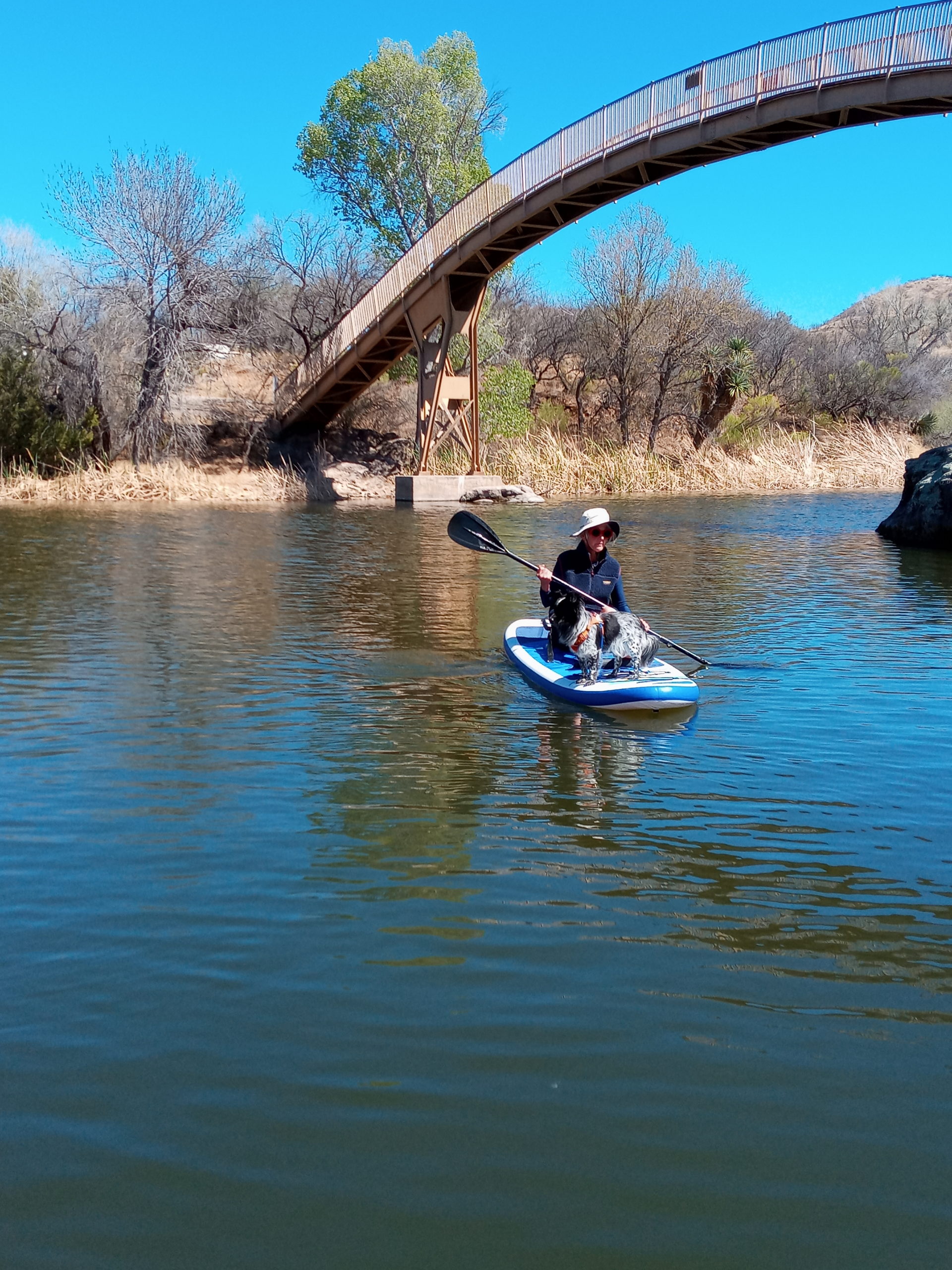 I am in the mood for a dip in water. We hoped to camp at Patagonia Lake SP. but dogs are only allowed in day area. We have lunch and use the SUP board there. Billy goes for a ride and scares some of the birds hiding in the marshy inlets on the side of the lake. So many birds!!