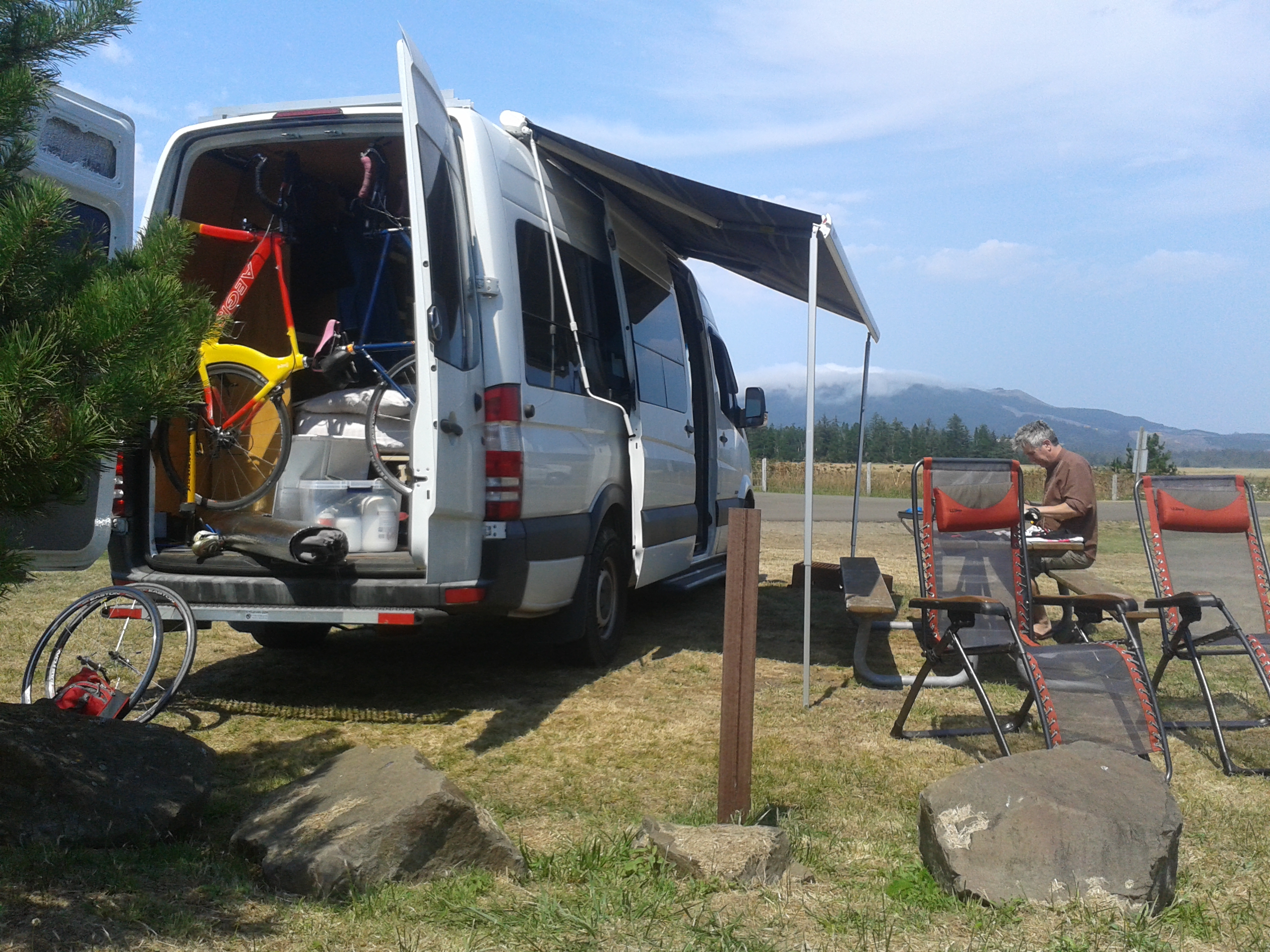 Camp at Willapa Bay (Bush Pioneer County Park, perfect quiet stop and warm showers, beach not so good). Stop at artsy coffee place in South Bend, catch ferry at Southworth/Vashon to Seattle.